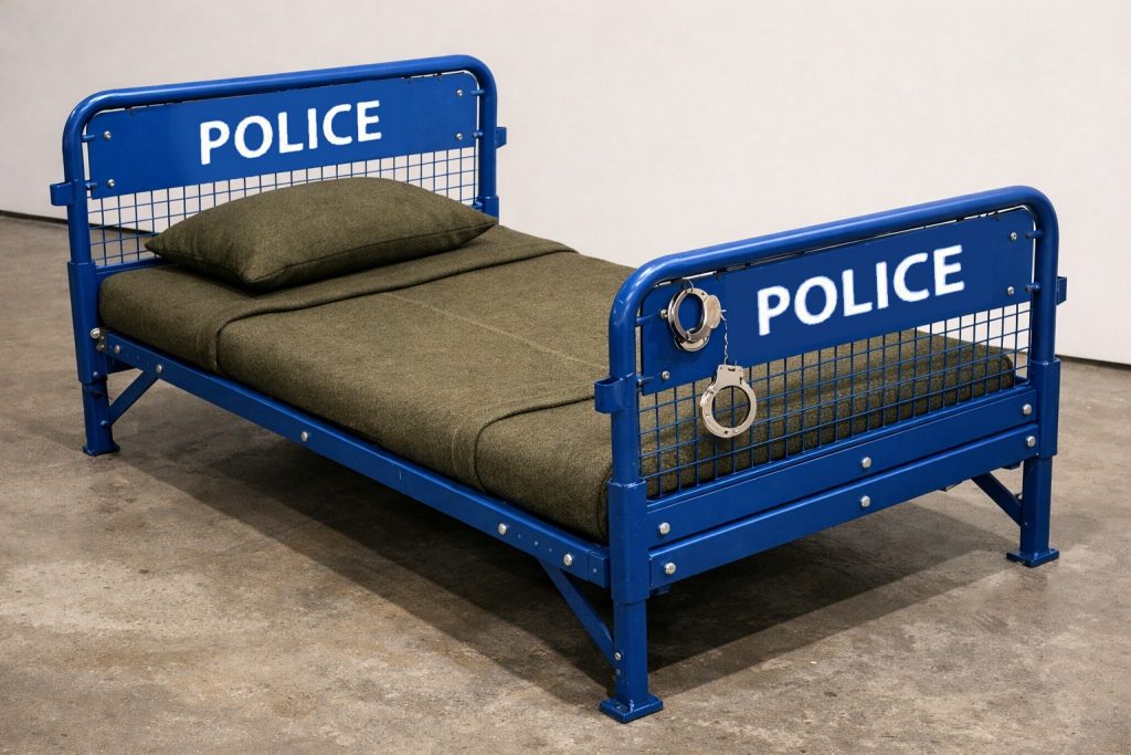 Bed/Barricade is a sculptural intervention composed of two iconic blue police barricades used in Istanbul, Türkiye, transformed into a military-style bed with handcuffs affixed to one side. This work deliberately omits text — even removing the word “police” — to emphasize form over language, inviting an unmediated engagement with its visual dialect.