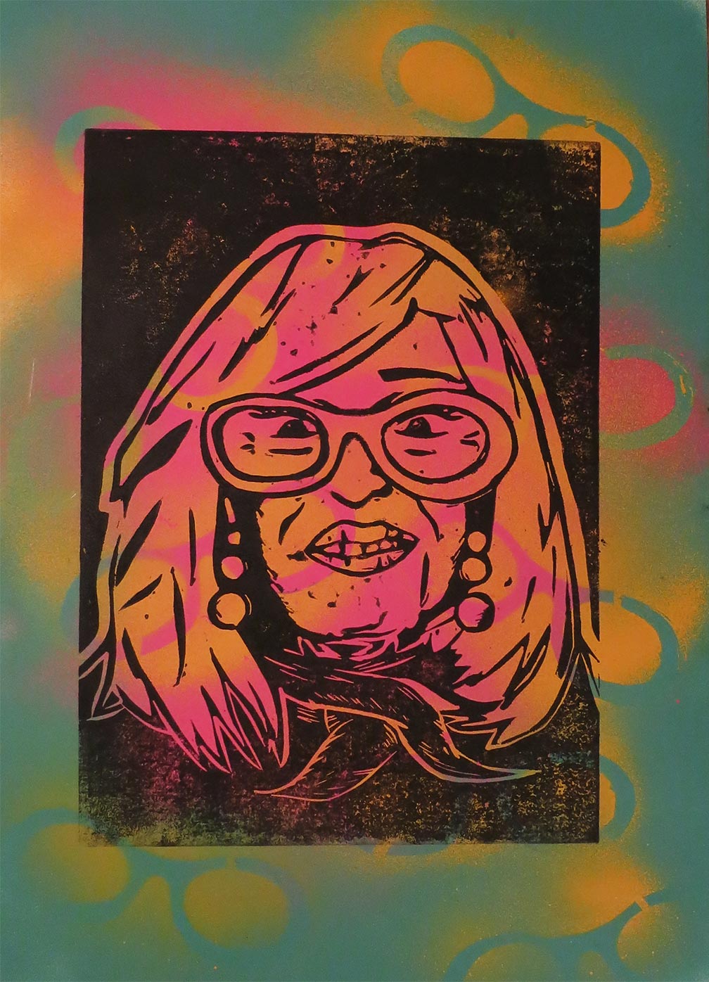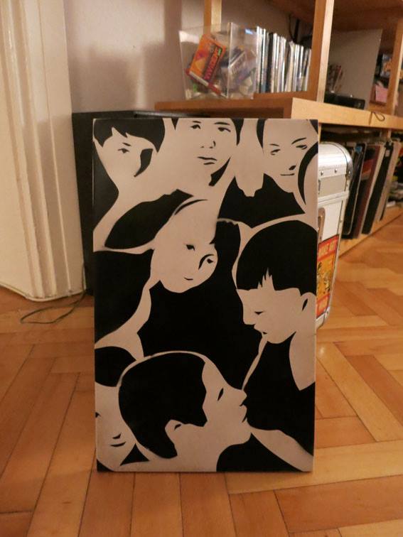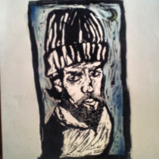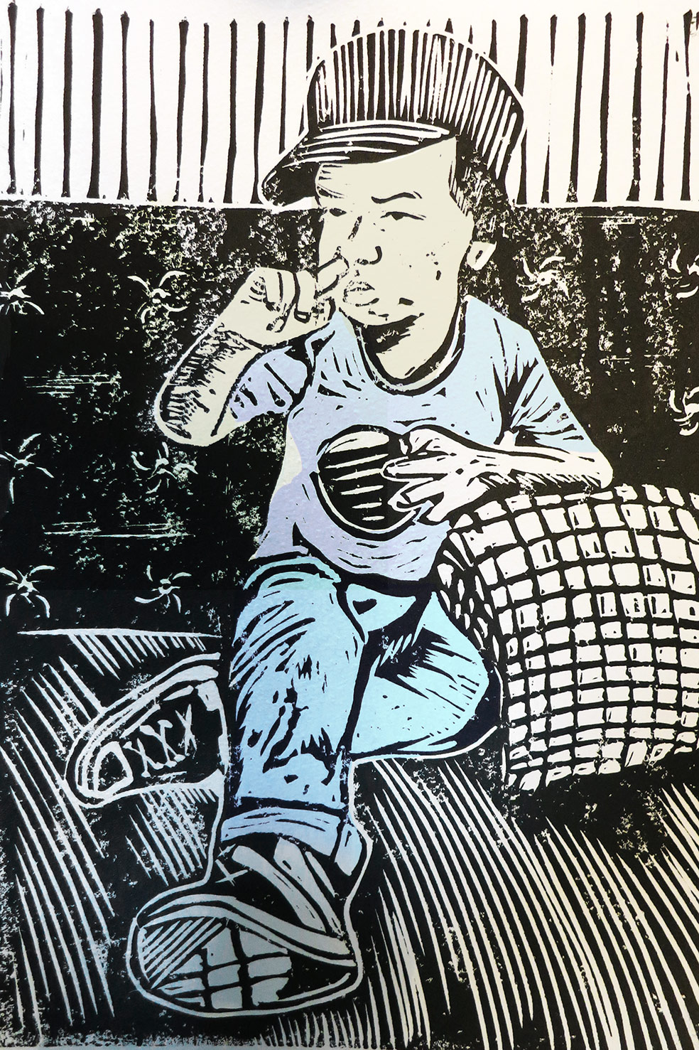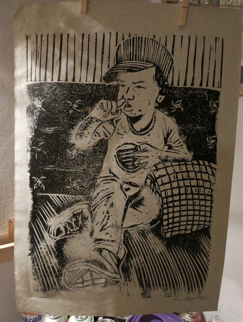 In 1995 I started going to art school at  The School of the Museum School of Fine Arts in Boston, MA. I started out by taking classes in photography, ceramic, latex/mixed material sculpture, jewlery making (WTF! ...my teacher later on advised me to drop the class because my hands were too big..haha..but I still have a couple of cool silver rings I made) drawing and painting and many more classes that dont come to mind right now. In my second year, with the mandatory classes assigned to me, I started printmaking classes which included woodcutting, etching, and lithography. Printmaking seemed a great way of expressing my art work, working with different materials first drawing onto wood, then carving it out and then printing and reproducing the image. Especially the fact that I could reproduce my work seemed very enticing to me which is probably why I started to do stencils.  As I was, and still am a very impatient artist, wanting to see the final product instantly, printmaking seemed like the best direction for me to go as it is a step by step process. As time progressed I staretd working with other materials such as comatex and linoleum.