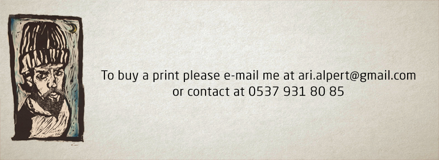 Ari Alpert was born in Manhattan, NY, in 1975. After spending his childhood in NewYork, London and Istanbul, he studied fine arts at the School of the Museum of FineArts, Boston. He worked in the fields of photography, ceramics, sculpture and jewellery design. He later focused on engraving, etching, lithography and printing,and especially the use of materials like Komatex and linoleum.After settling in Turkey in 2000, he set up his own silkscreen printing workshop.