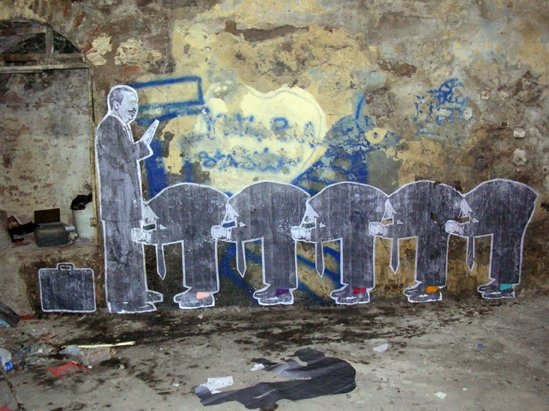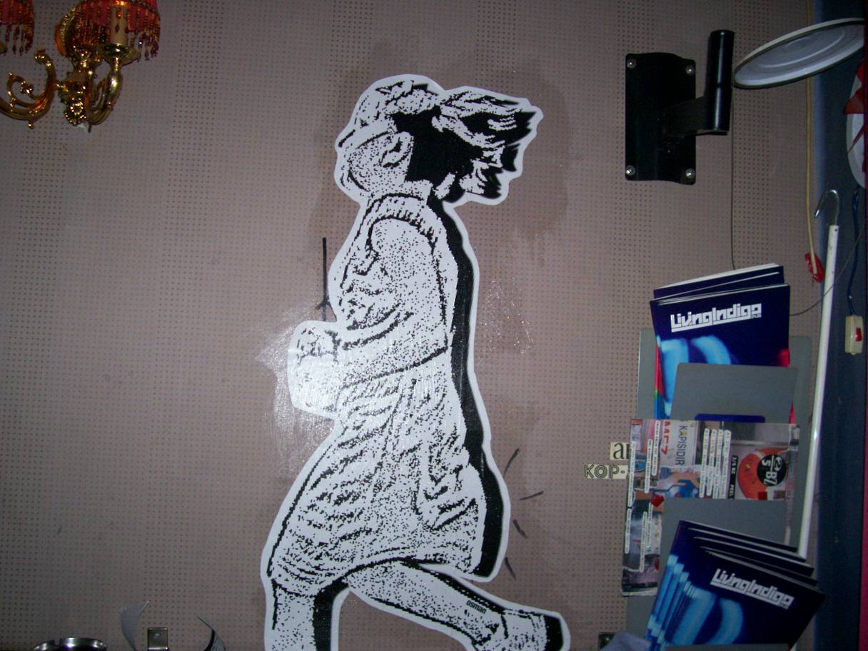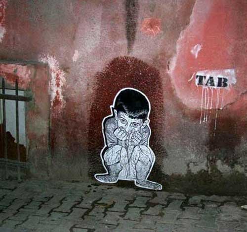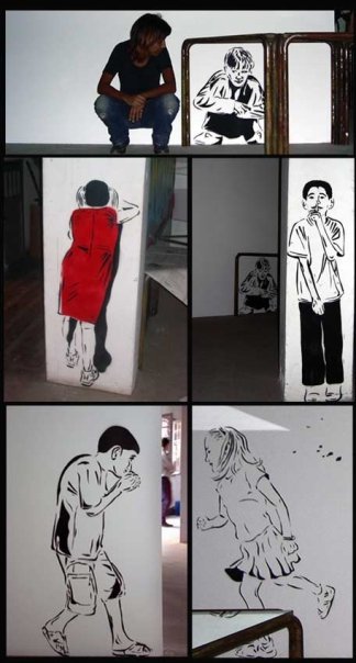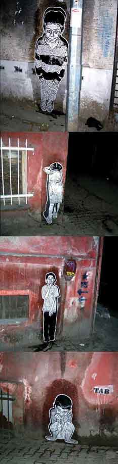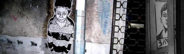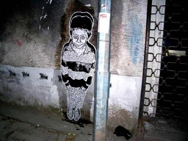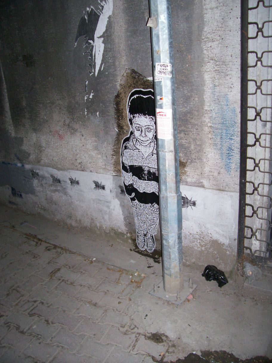 After feeling that I had completed my mission with the Obey image I produced a whole bunch of street art. One series that caught much appraise was a piece that I did with wheat paste with street kids playing hide and seek throughout the city. I later did an installation of the piece for the 9th International Bienalle with Luca Frie, Turbo and flypropaganda.