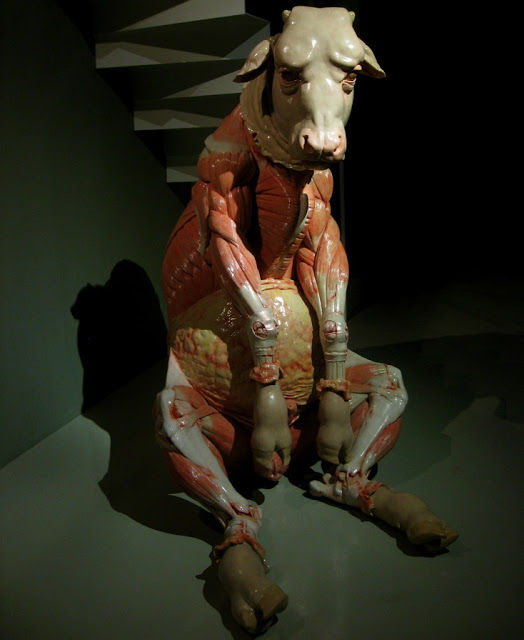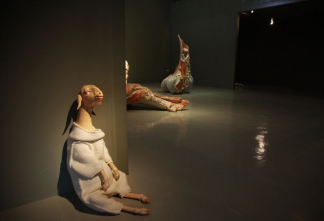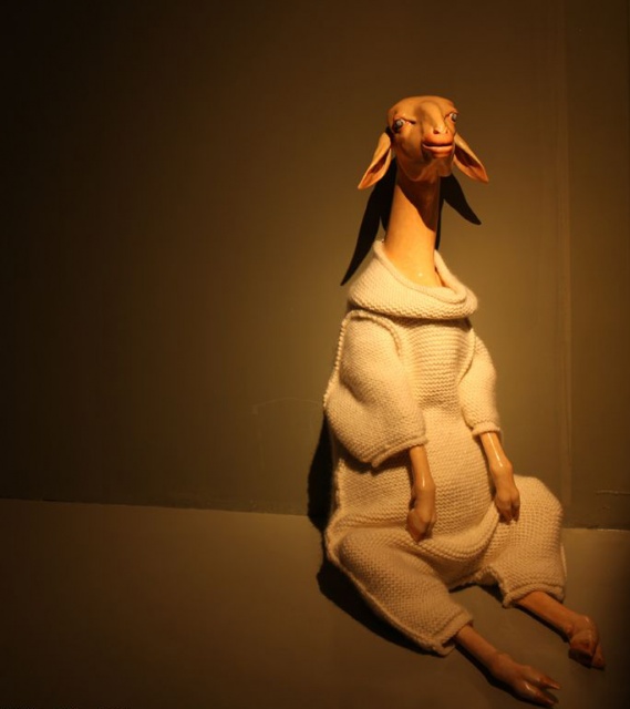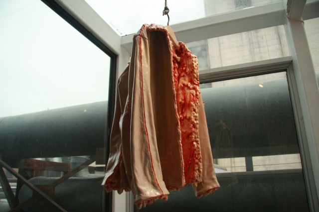Among the destroyed buildings and bleak reality, Banksy is shown painting a piece titled "Bomb Damage" that depicts the Greek goddess Niobe cowering and weeping in the only part that remains of a building. The goddess, a bereaved mother who lost her children due to pride, illustrates in Greek mythology how the gods will not hesitate to take vengeance on human arrogance.