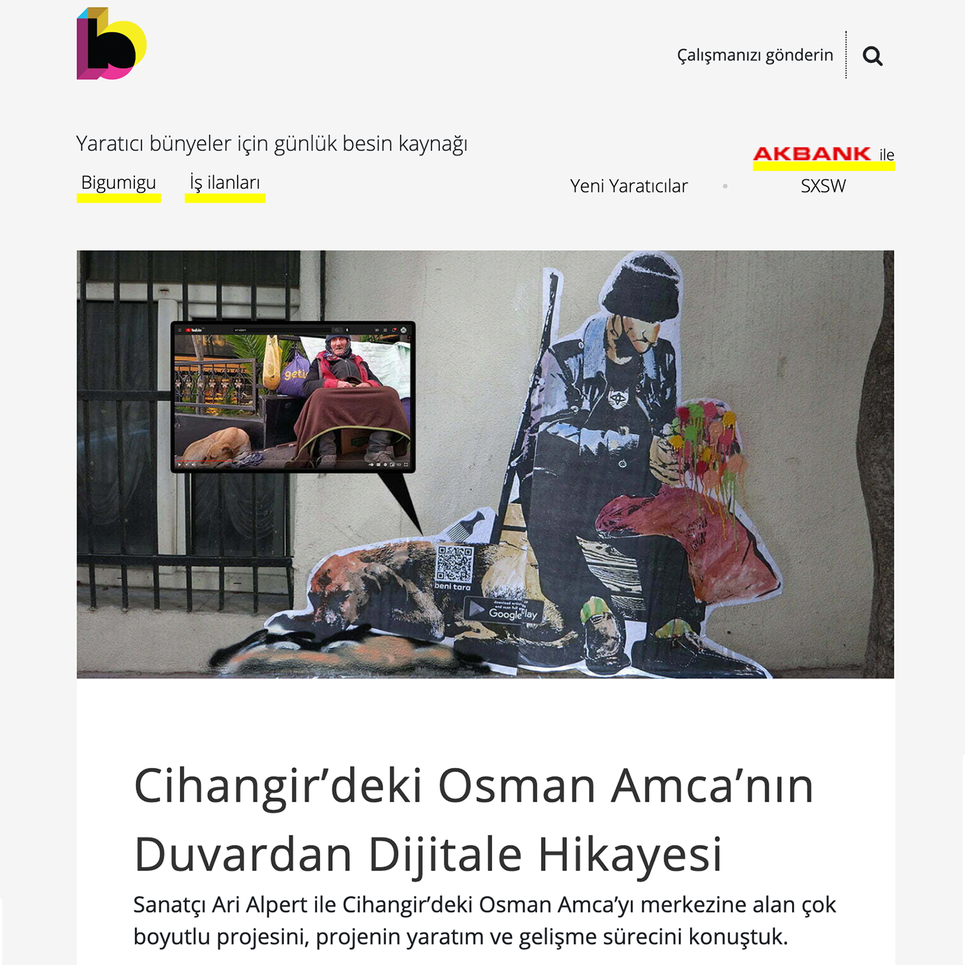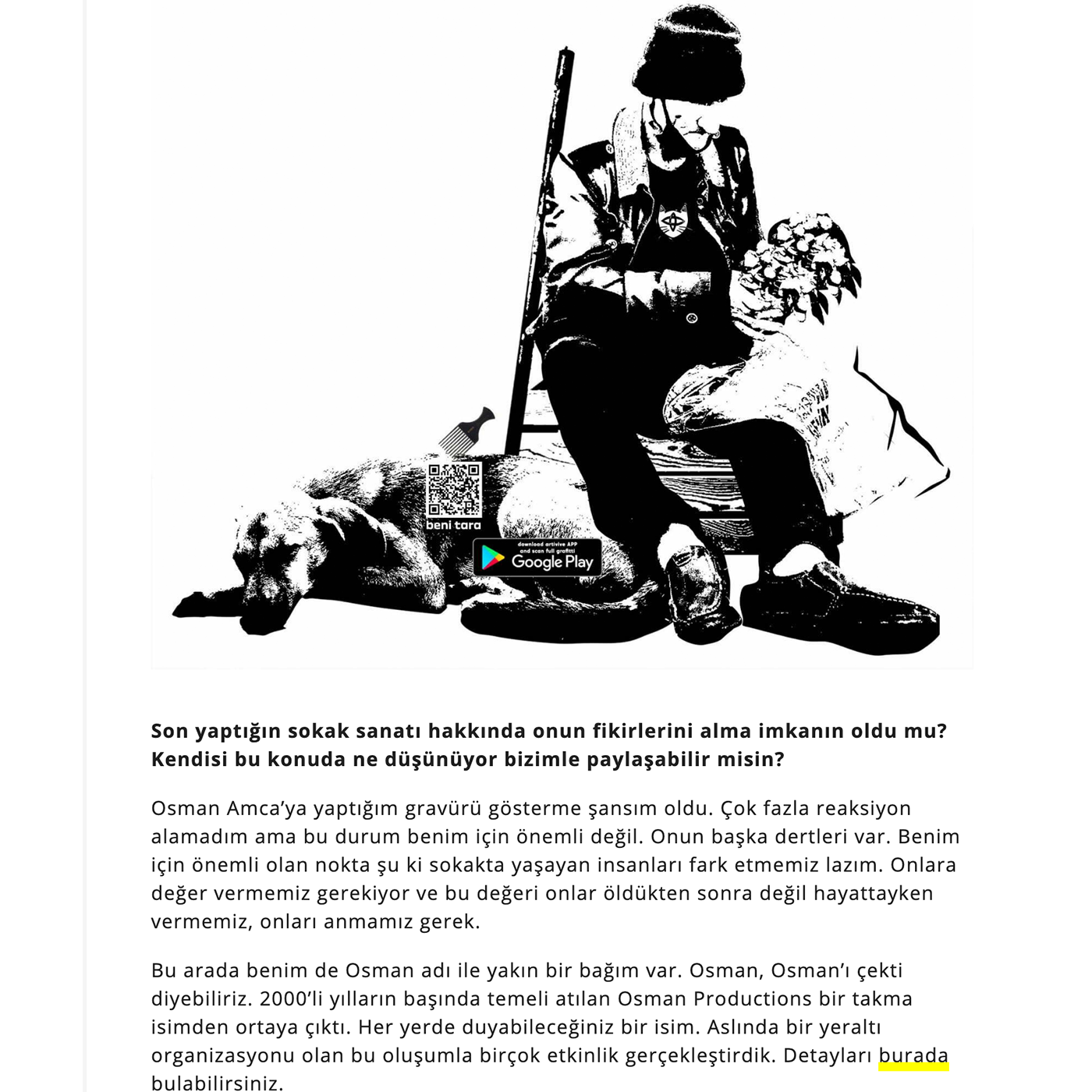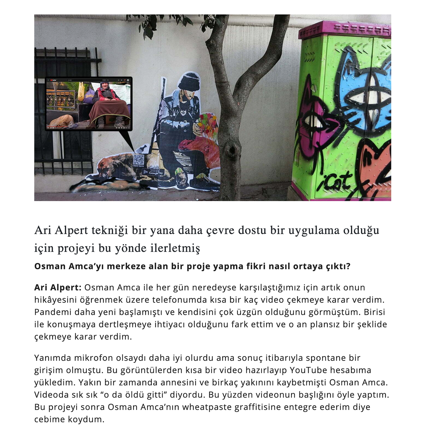 Sokak sanatçısı Ari Alpert ise Osman Amca’yı bir sanat eserine dönüştürdü: “Yaklaşık 20 senedir Cihangir’de yaşıyorum. Eve gidip gelirken onu görüyorum hep. Bir gün onun hikâyesini öğrenmek için video çekmeye karar verdim. Pandemi yeni başlamıştı ve onun çok üzgün olduğunu gördüm. Sanki biriyle dertleşmeye ihtiyacı var gibiydi. Bir yandan videosunu çekip bir yandan hikâyesini dinlerken annesini yeni kaybettiğini ve o sene birkaç yakınını daha kaybettiğini öğrendim. Sürekli ‘O da öldü gitti’ diyordu…”