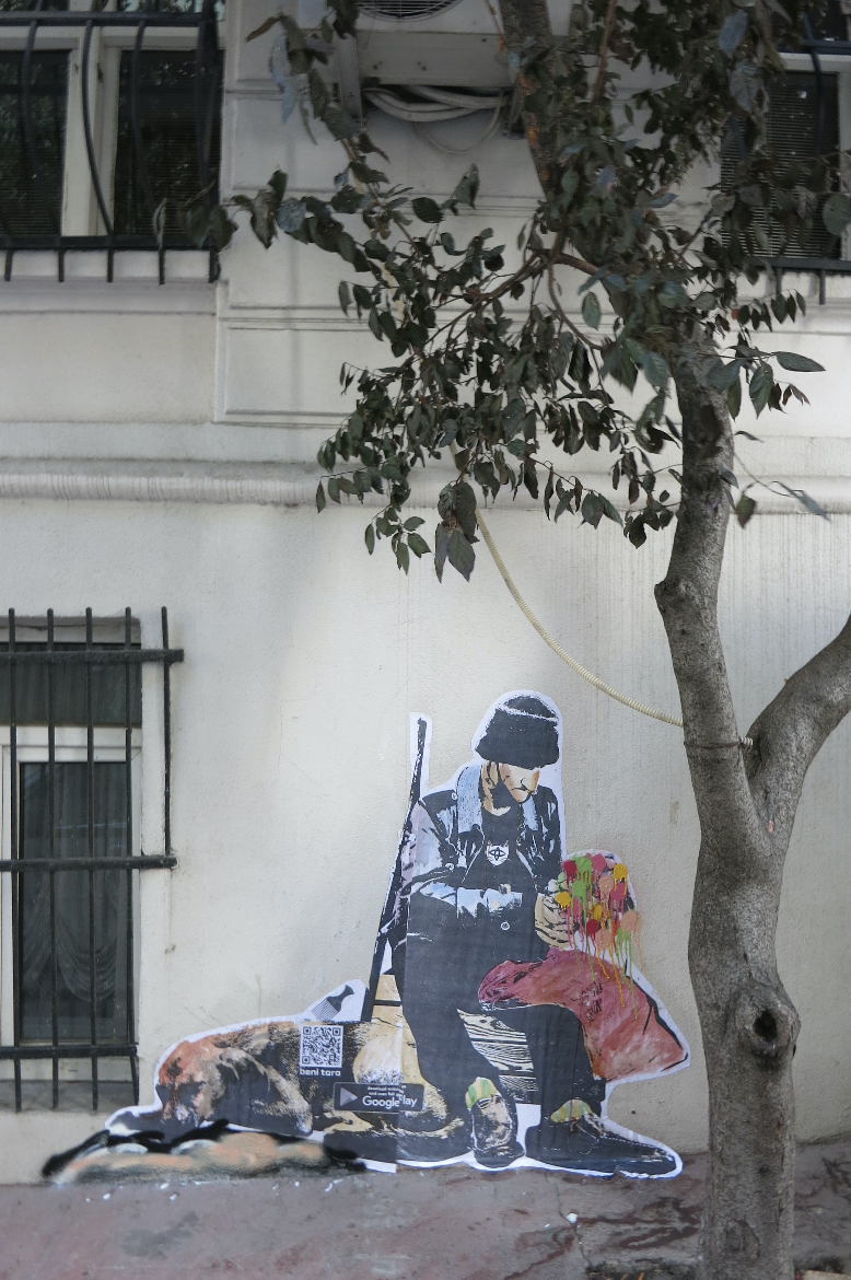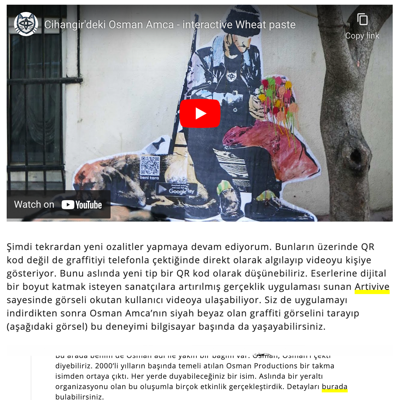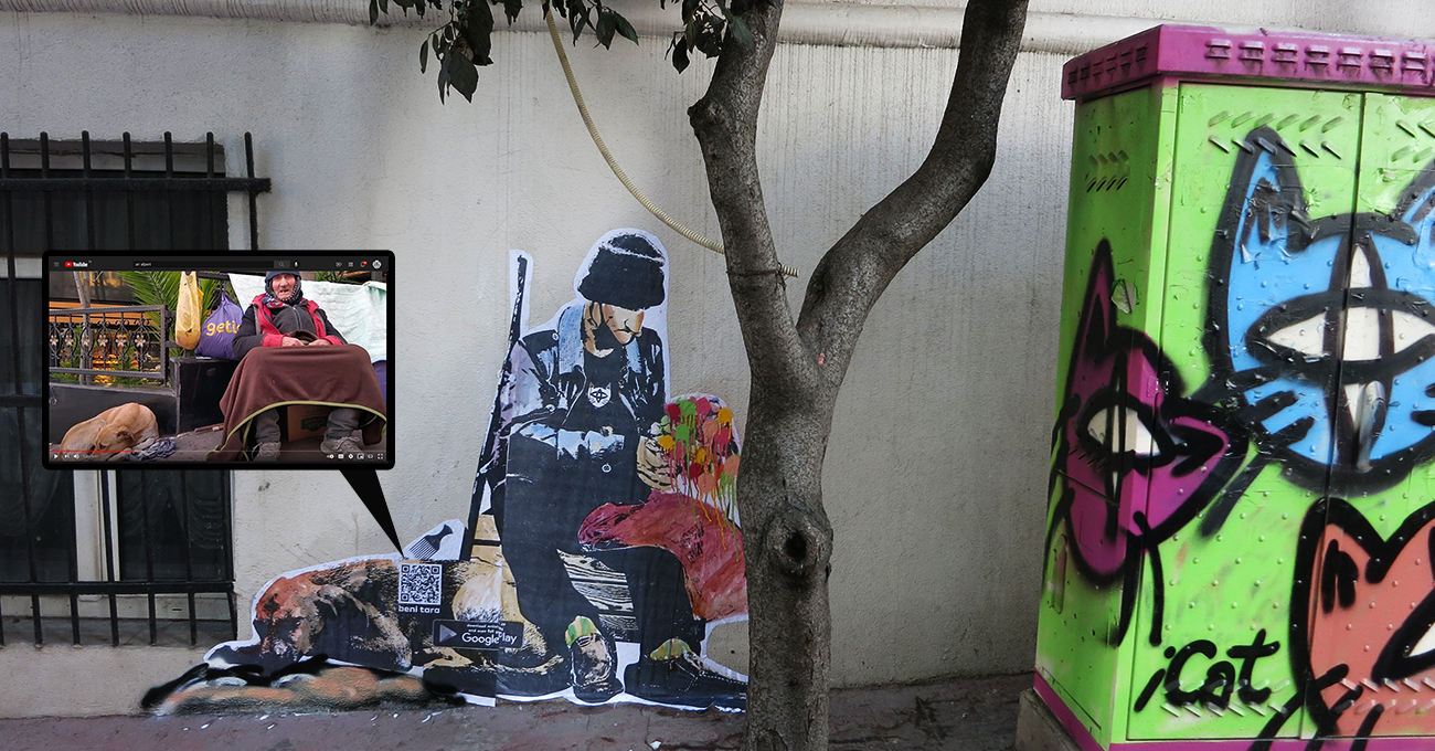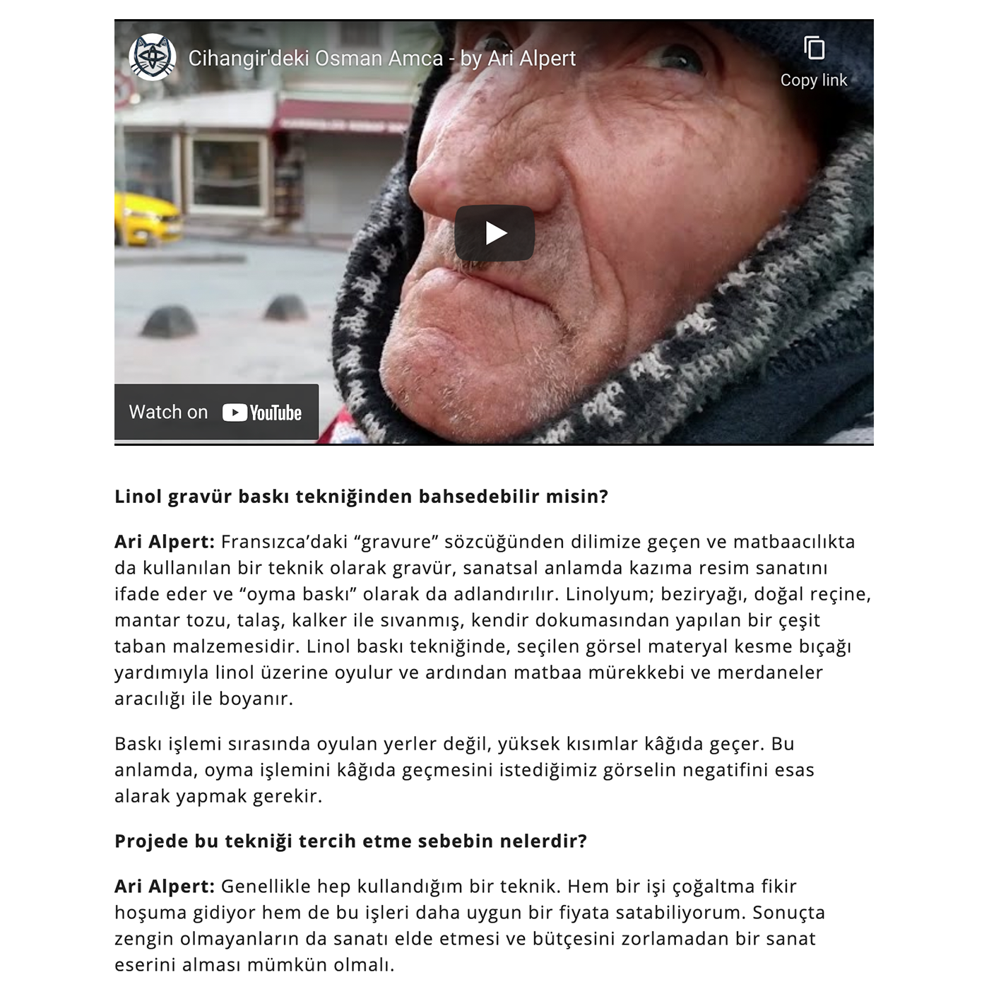 Sokak sanatçısı Ari Alpert ise Osman Amca’yı bir sanat eserine dönüştürdü: “Yaklaşık 20 senedir Cihangir’de yaşıyorum. Eve gidip gelirken onu görüyorum hep. Bir gün onun hikâyesini öğrenmek için video çekmeye karar verdim. Pandemi yeni başlamıştı ve onun çok üzgün olduğunu gördüm. Sanki biriyle dertleşmeye ihtiyacı var gibiydi. Bir yandan videosunu çekip bir yandan hikâyesini dinlerken annesini yeni kaybettiğini ve o sene birkaç yakınını daha kaybettiğini öğrendim. Sürekli ‘O da öldü gitti’ diyordu…”