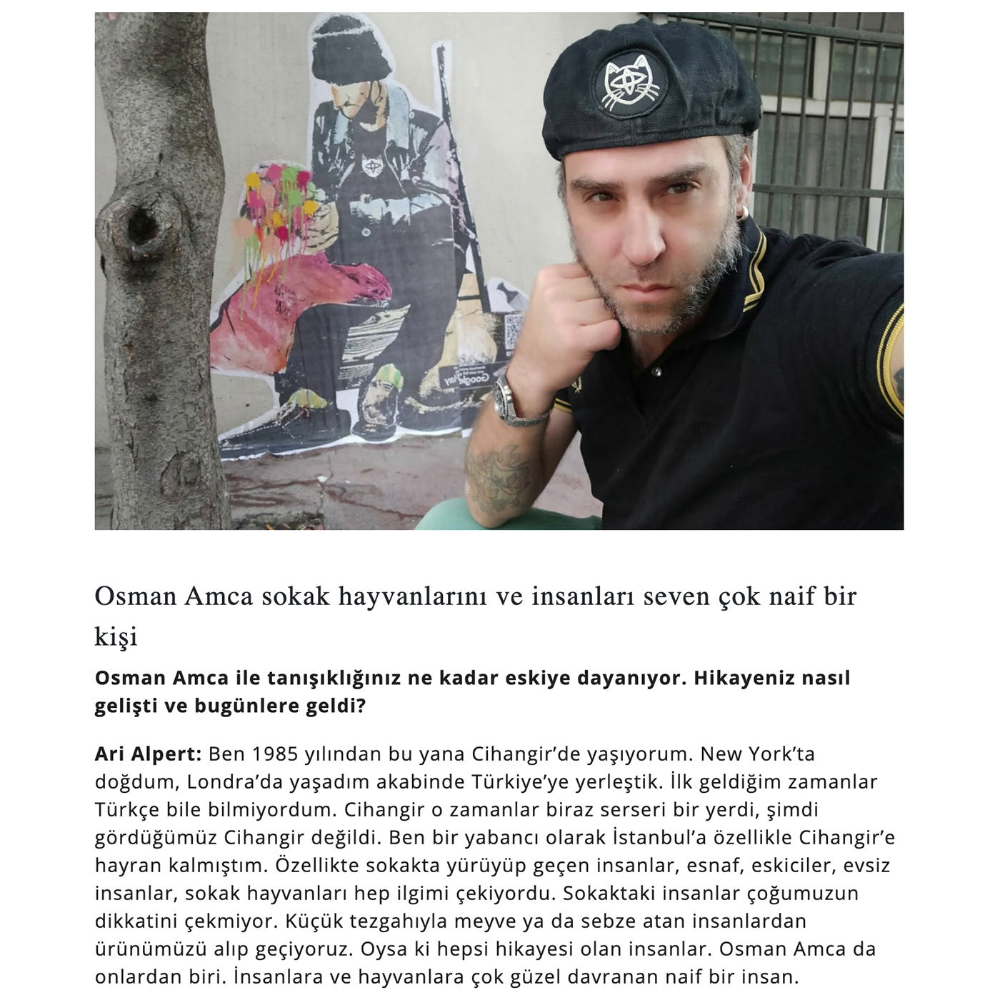 O elinde değneği, fareli köyün kavalcısı edasıyla hayvanların peşi sıra takip ettiği, Cihangir’in Osman Amcası… 80 yaşındaki Osman Amca (Ekici) sokak sokak gezip ne kadar kedi-köpek varsa karnını doyurur, gelene geçene selamının yanında bir de çiçek uzatır. Yıllardır semtin simgesi haline gelen Osman Amca şimdi, bir sanatçının kendine has ‘street art’ tekniğiyle yaptığı çalışmayla sokak sanatına dönüştü, Altın Bilezik Sokak’ta bir duvarı süslüyor! Üstelik üzerinde QR kod bulunan bu resme telefonunuzu tuttuğunuzda Osman Amca ekranınızda belirip size kendi hikâyesini anlatmaya başlıyor. Hem eserin sahibi Ari Alpert hem de Cihangir sokaklarının masal kahramanı Osman Amca’yla konuştuk.