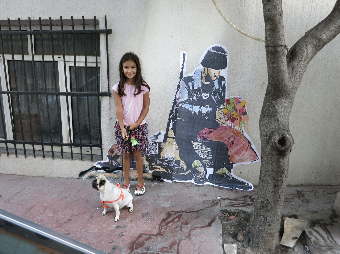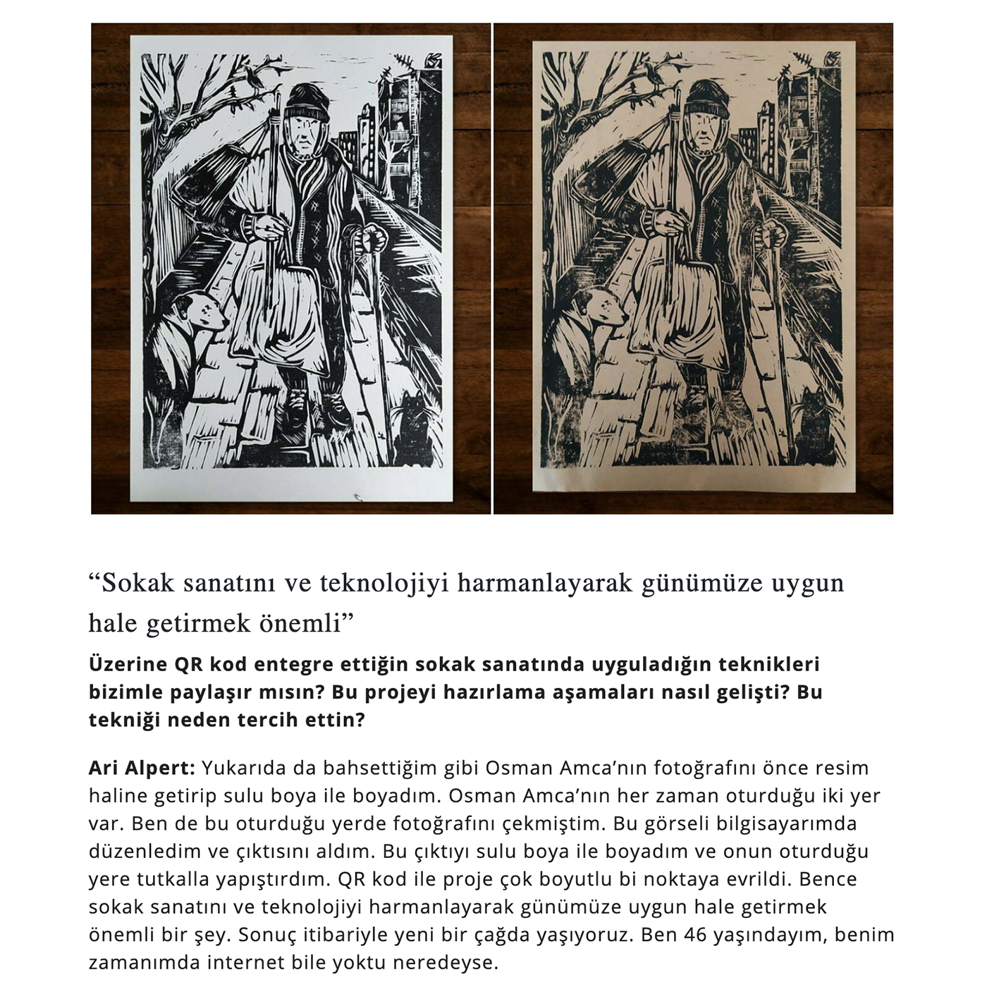 Sonra Osman Amca’nın fotoğraflarını çekmeye başlamış Alpert… Eserin nasıl bir teknikle ortaya çıktığını da şöyle anlatıyor: “Daha sonra o fotoğrafları bilgisayarımda düzenleyip sulu boyadan geçirdikten sonra duvara tutkalladım. Duvarlara zarar vermemesi için sprey boya yerine zamanla yok olan, doğa dostu teknik wheatpaste’i uyguladım. Bir de daha önce çektiğim videoları resme entegre edebilmek için QR kod ekledim. Bunu telefona okuttuklarında karşılarına çıkan kısa filmle, sokaktan geçen insanlara Osman Amca’yı dinleme fırsatı doğdu. Çünkü sokaktaki insanları fark etmemiz, onlar öldükten sonra olmamalı. Onlara yaşarken değer vermemiz lazım diye düşünüyorum.”