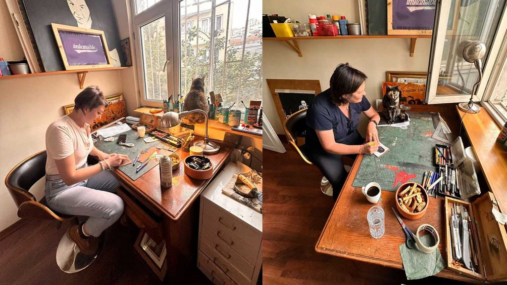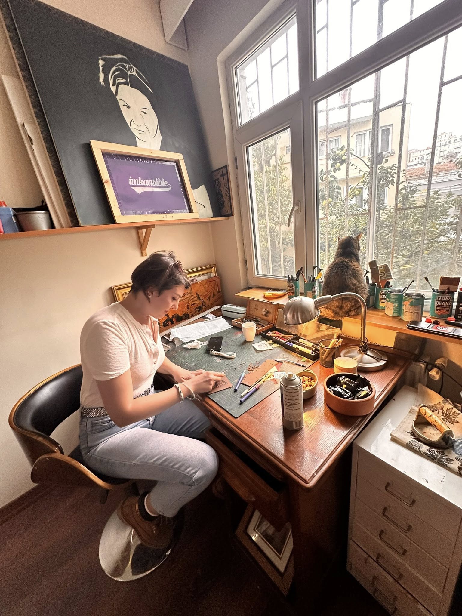 My old studio was almost three times bigger than this one. But over time I realized that it’s not just about square meters. My new studio has a garden, which is an incredible luxury for me. In the summer, I give engraving classes in the garden. Of course, we also work inside, but having that outdoor space completely changes the atmosphere. In Cihangir, finding a garden is almost impossible.