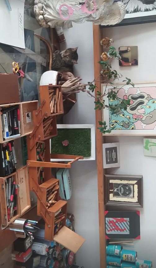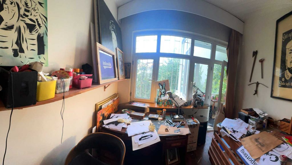 I see my studio as a playground, and I have lots of “toys,” meaning materials. Everything is there: glue, paint compressors, spray paint, watercolors, oil paints, nails, hammers—anything I might need. The biggest feature of my studio is that when an idea comes to my mind, I can immediately realize it.
