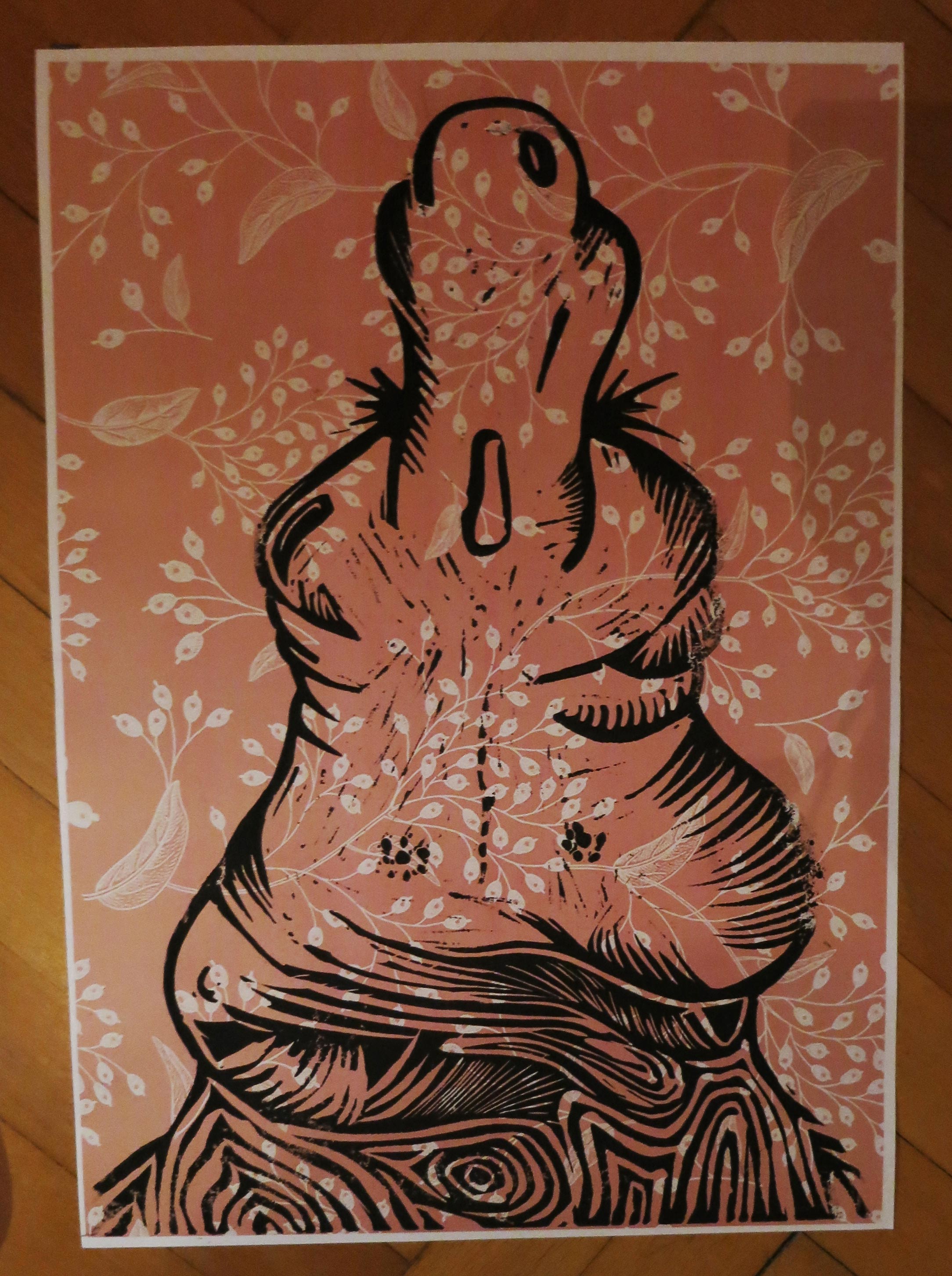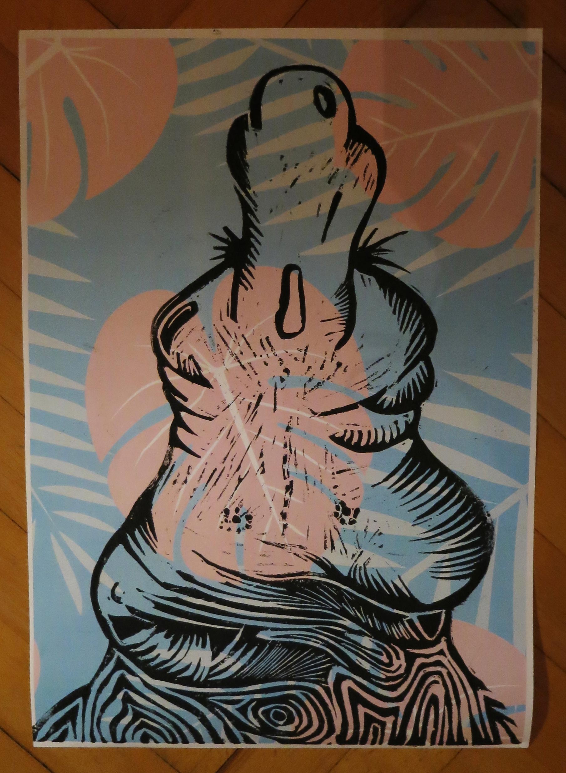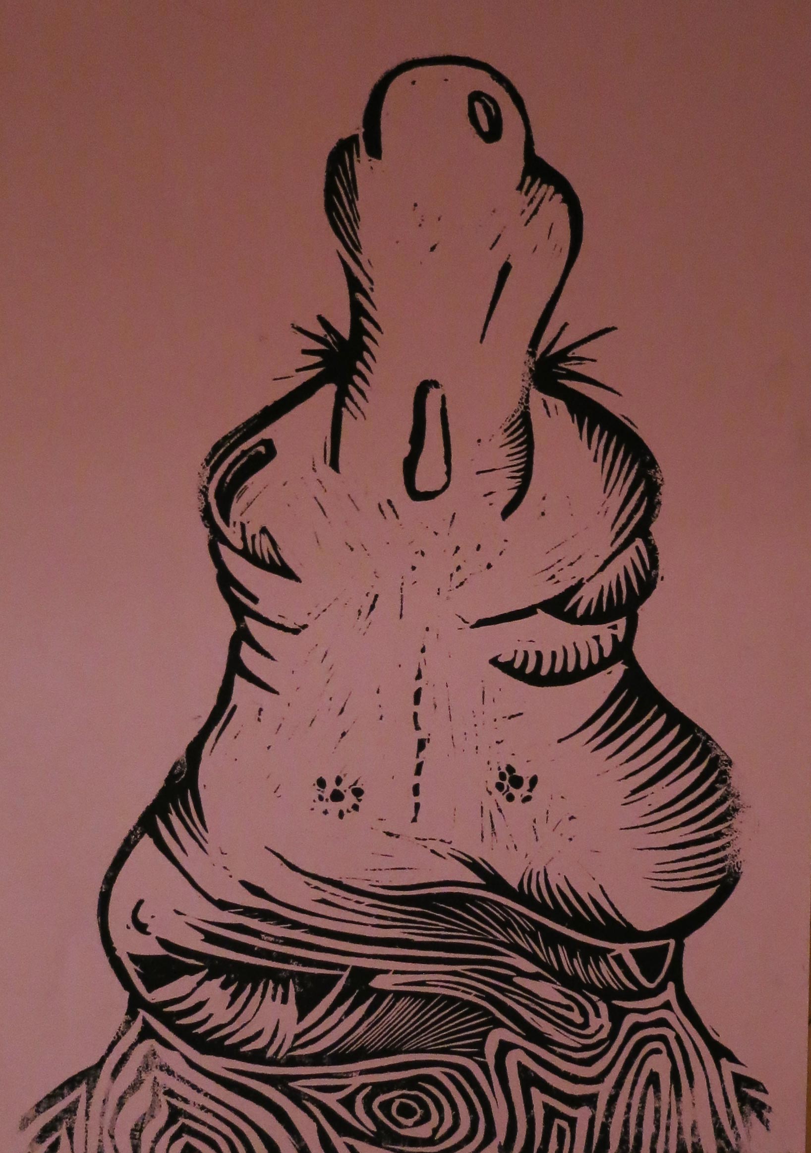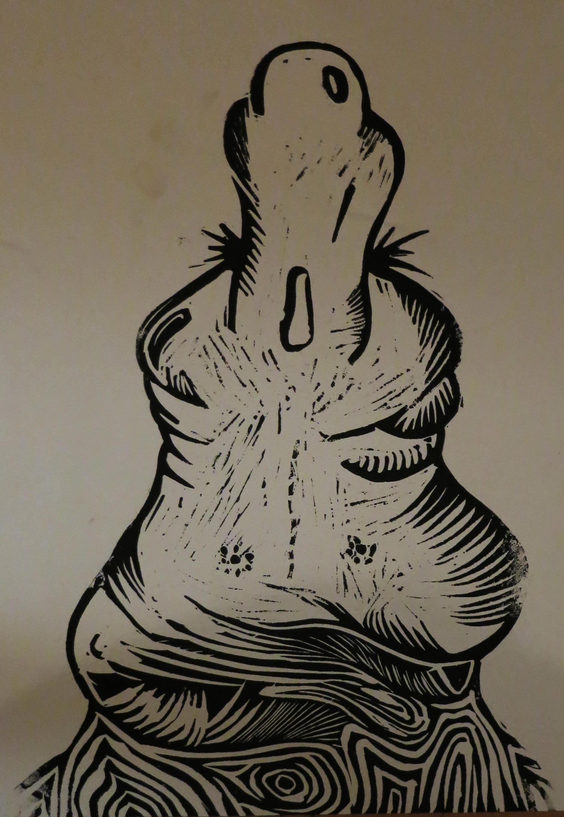 “Leftover love handle meat” linocut 2019 – Ari Alpert