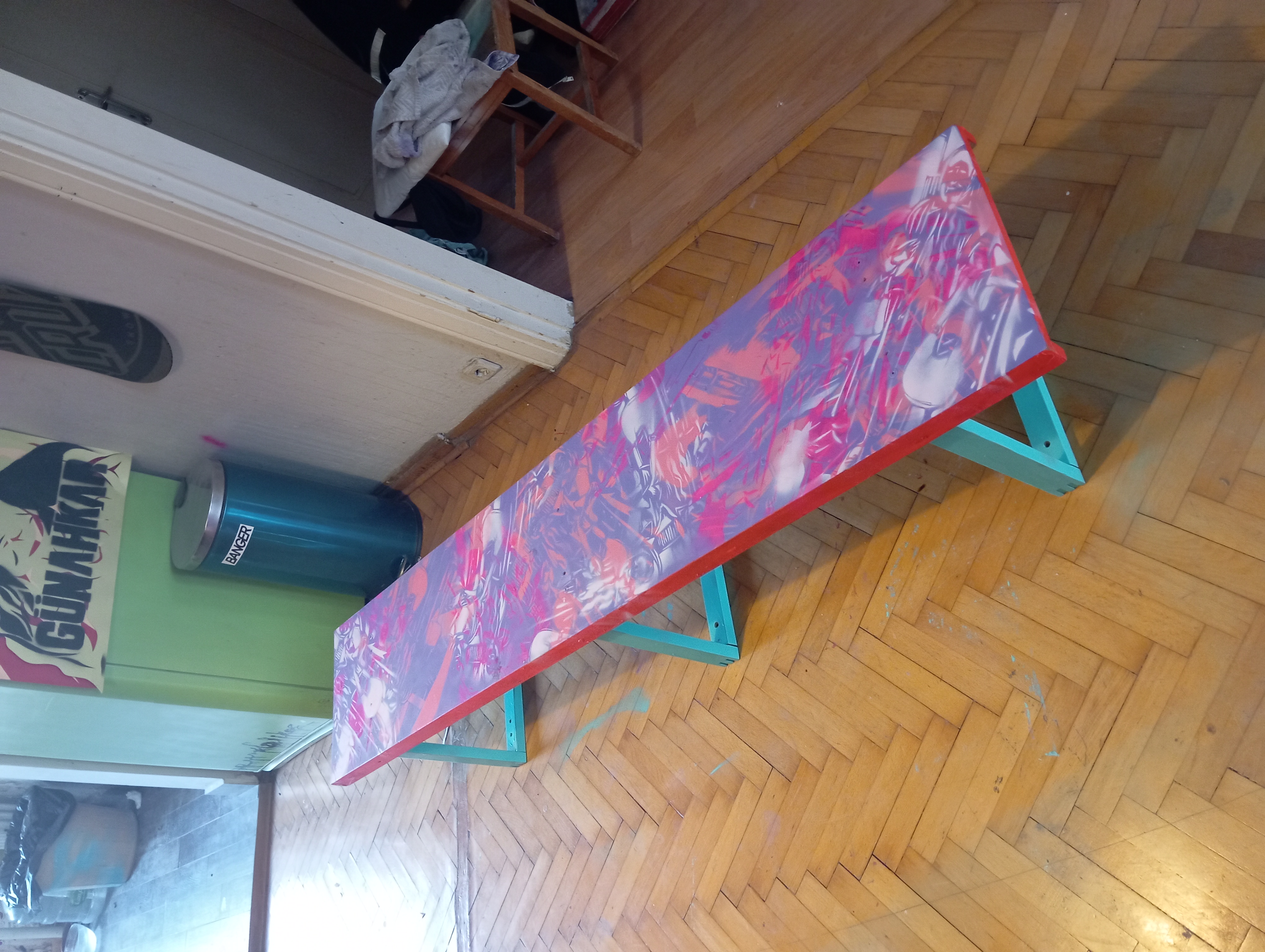 Ayrıca, bugün radyomuza gelen herkes Batsın Bu Dünya mırıldanıyordu çünkü Ari Alpert dün bu gördüğünüz stencilı tasarlamıştı. Bugün de bir geldik, stüdyomuzun avlusunda aynı stencil!