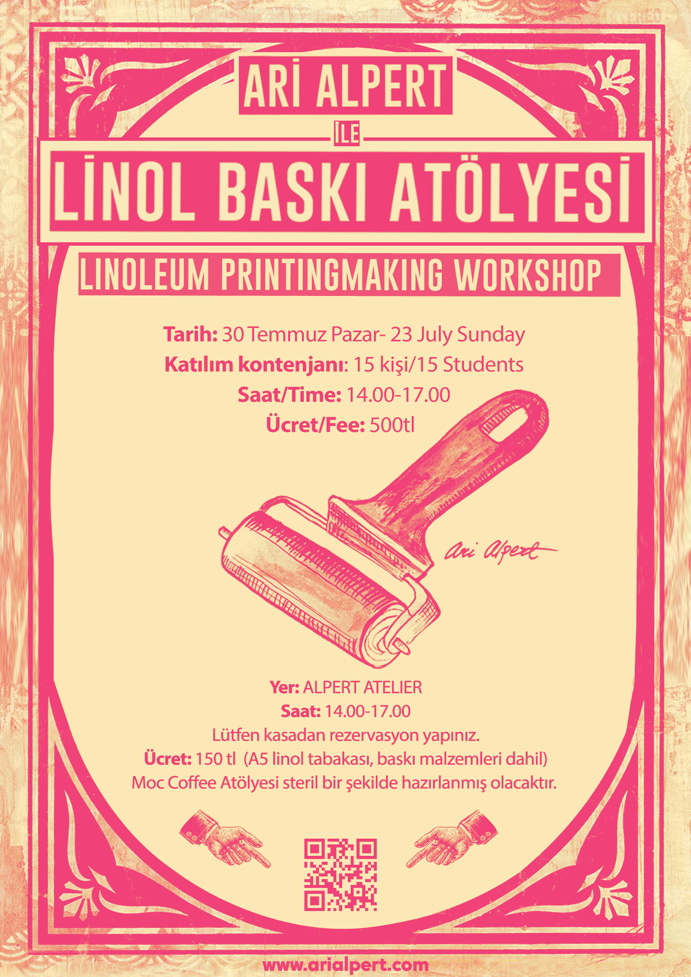 Kapora 250TlLinol Baskı Atöylesi - Linoleum Printing WorkshopTarih: 23 Nisan PAZAR 23rd April SundayYer: ALPERT ATELIER - CIHANGIRSaat:14.00-17.OOİletişim ve rzv: 05379318085 or DM.Fransızca’daki “gravure” sözcüğünden dilimize geçen ve matbaacılıkta da kullanılan bir teknik olarak gravür, sanatsal anlamda kazıma resim sanatını ifade eder ve “oyma baskı” olarak da adlandırılır.Linolyum; beziryağı, doğal reçine, mantar tozu, talaş, kalker ile sıvanmış, kendir dokumasından yapılan bir çeşit taban malzemesididr. Linol baskı tekniğinde, seçilen görsel materyal kesme bıçağı yardımıyla linol üzerine oyulur ve ardından matbaa mürekkebi ve merdaneler aracılığı ile boyanır. Baskı işlemi sırasında oyulan yerler değil, yüksek kısımlar kağıda geçer. Bu anlamda, oyma işlemini kağıda geçmesini istediğimiz görselin negatifini esas alarak yapmak gerekir.Linol baskı için gereken malzemeler her katılımcı için hazırlanmış olacaktır;- Bir adet 10.5x15 cm boyutunda kesilmiş linolyum tabaka- Linolyum kesme bıçağı (satın alma olasılğı)- Üzerine baskı yapılacak kağıt- Baskı işlemi sırasında kullanılacak tahta kaşık - MürekkepKatılımcılar atölyede seçecekleri hazır görselleri, örnekteki gibi oyma işlemine ve 10.5 x15 cm oranına uygun halde hazırladıkları görselleri ya da marker kalem ile doğrudan linolyum üzerine çizecekleri deseni çalışabilirler.Atölyemizde, basılacak görselin seçimi ve hazırlanması ile ilgili kısa bilgilendirmenin ardından, gravür sanatçısı Ari Alpert eşliğinde baskıya dair tüm süreç ve uygulamaları deneyimleyecek olan katılımcılarımız, kendileri ya da yaklaşan sevgililer gununde sevdiklerine hediye etmek için küçük ve edisyonlu birer seri üretme şansı yakalayacaklar. GoogletranslateTurkish – detectedEnglish