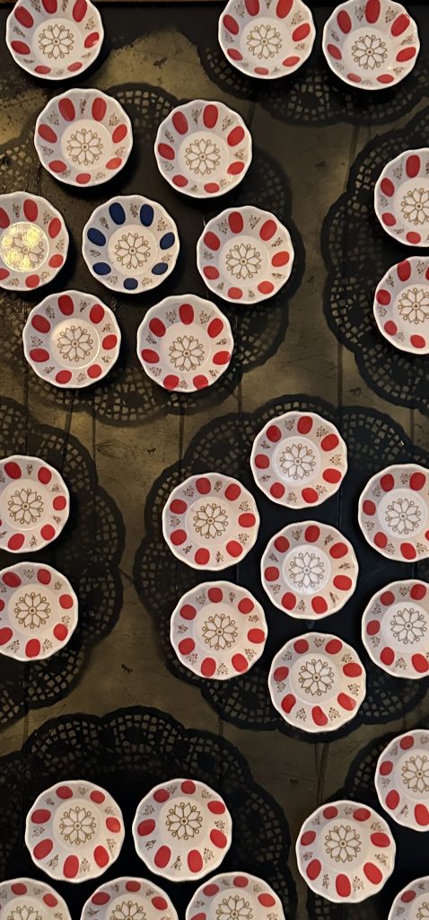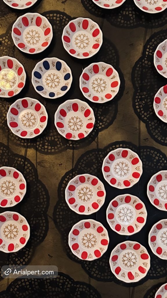 The red patterns reference the ideal color of tea, known in Turkish as “rabbit’s blood,” while the seven repeating red forms around the plate symbolize the seven days of the week. In this way, the nalbeki brings together time, ritual, and repetition within a single surface.